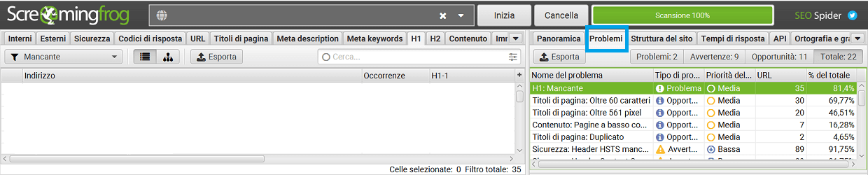 Succesivamente sono andato nella sezione “Problemi” e ho strovato tutti gli errori presenti sul sito.